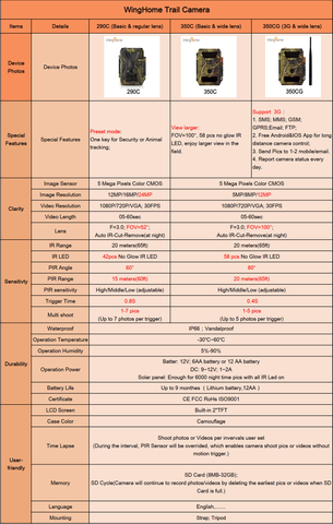 The comparison of WingHome Scout Camera are as following, you can choose a most suitable one according to the full aspects of a best quality game camera.