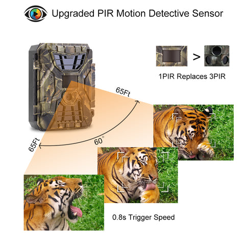WingHome 290C game camera takes the new PIR sensor technology to realize fast motion detective. Instead of 3 sensor-type, the old technology in which there are one core sensor plus two assistant sensors, WingHome's one enhanced PIR sensor can perform more efficiently and means less space occupied and good for efficient waterproof. And using a high-quality trail camera normally has a 60° angle and captures anything passing by.